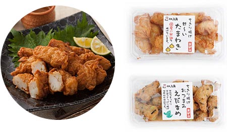 石臼でじっくりと時間をかけ練りあげた上質な白身魚に、旬の具材をたっぷりと練り込み、ひと口サイズに’ちぎりながら’油へ落としていく方法で仕上げた、長年人気の商品です。「ちぎり揚げ玉ねぎ」は国内産の生玉ねぎを大き目にカットしたっぷりと練り込んでいます。特に3月~6月頃までは地元知多半島産の上質な玉ねぎを使用。地産地消品としても注目です。「おつまみ枝豆」はごろごろと入った枝豆の粒と相性が良い“ひじき”が旨味を増しています。