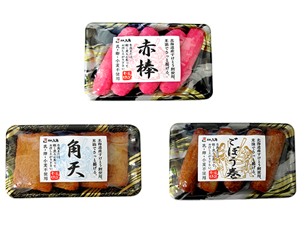 1枚ずつ丁寧に包み包装した、当社一番人気の生食用大判揚げです。裏面には一括表示も付いているので、バイキング形式で、お客様は手にとって1枚ずつ選びご購入頂けます。種類は全部で8種類。写真のように60枚入りトロ箱販売なら、そのままお店に出して販売が出来るので手間いらず。また活気や賑わいも演出出来ます。近年では鮮魚売り場で販売して頂くケースも増えています。