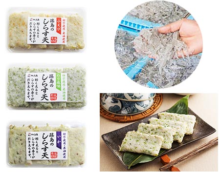 日本有数の漁場篠島で水揚げされた「しらす」の香りが引き立つはんぺい(さつま揚げ)です。篠島のしらすメーカー様協力のもと、練製品に最適な味と食感になるよう、しらすの水分・塩分・乾燥具合などを微妙に調整し、最適なしらすに仕上げて頂きました。このこだわりのしらすを練り込んだ本品は、「炙って旨い」をコンセプトに、軽く焼く事で一番旨味を引き出せるように仕上げた逸品です。しらすの香りが引き立つ3種類の味を是非お楽しみ下さい。
